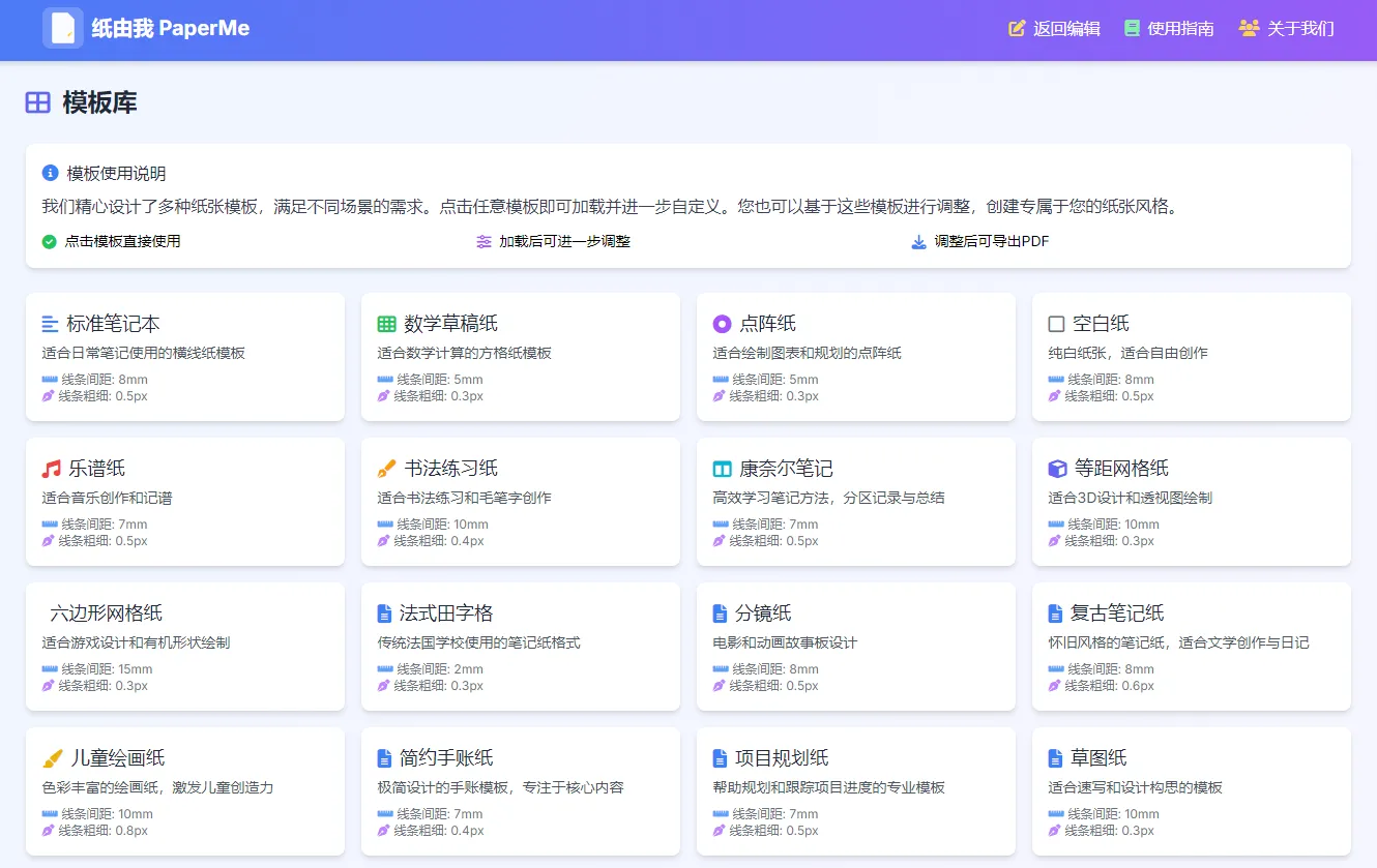 新增纸张 - 复古笔记纸、儿童涂鸦纸、简约手账纸、学生笔记纸、会议笔记纸、项目规划纸、草图纸、创意记录纸、品牌定制纸、米字格、回宫格、九宫格、中国田字格、交叉格