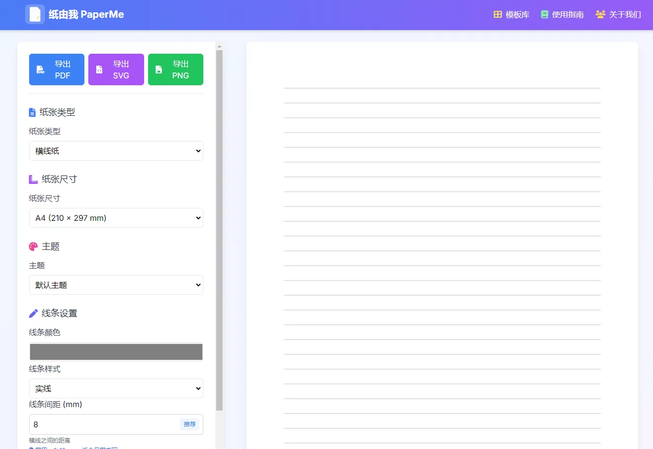 你可以调整“线条颜色”“线条样式”“线条间距 (mm)”和“线条粗细 (px)”,让纸张更贴合具体用途。
