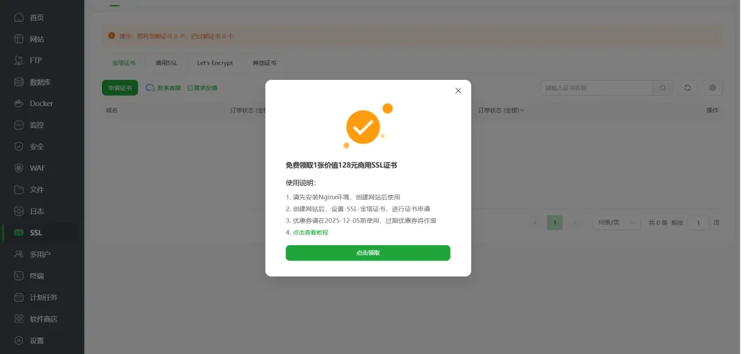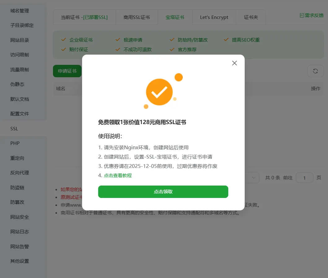 2.点击SSL就会有弹窗,免费领取一年的商用SSL
