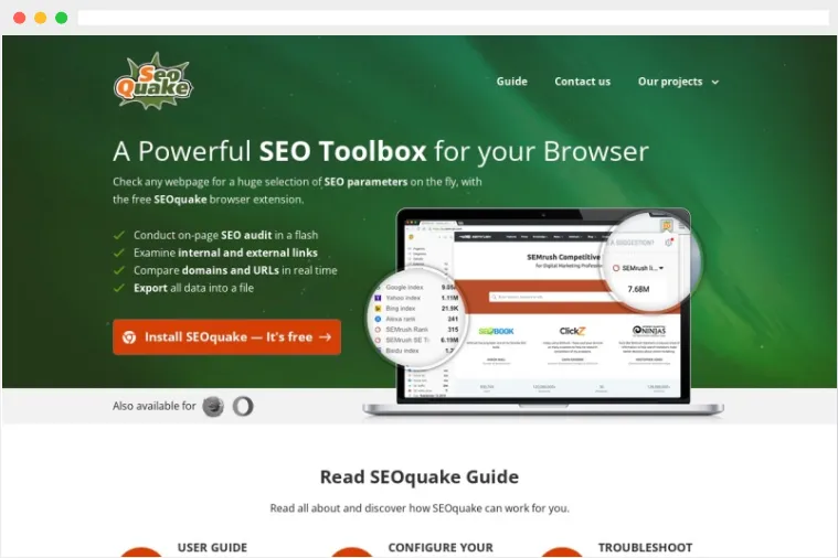 SEOquake是一款免费的浏览器扩展程序,提供了有关搜索结果中看到的页面和访问的网站的宝贵SEO数据。它显示了权威分数(AS)、页面流量、反向链接等指标,帮助SEOER们快速了解网站的SEO状况。