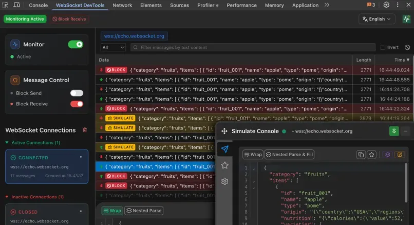 但是现在,有了 WebSocket DevTools,调试问题终于迎刃而解!这个工具让所有的抓包、修改、断网及重放功能都变得简单明了,完全不需要再依赖复杂的操作。