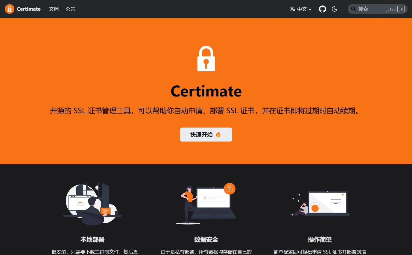 一个开源且免费的自托管 SSL 证书管理工具,能够自动化 SSL 证书的申请、部署、续期以及通知的整个生命周期,支持各大主流云厂商。
