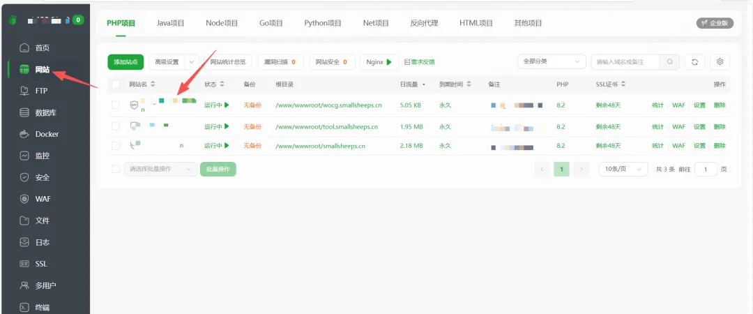 领取教程1.点击宝塔左侧的网站,再随便选择一个已经部署好的网站项目