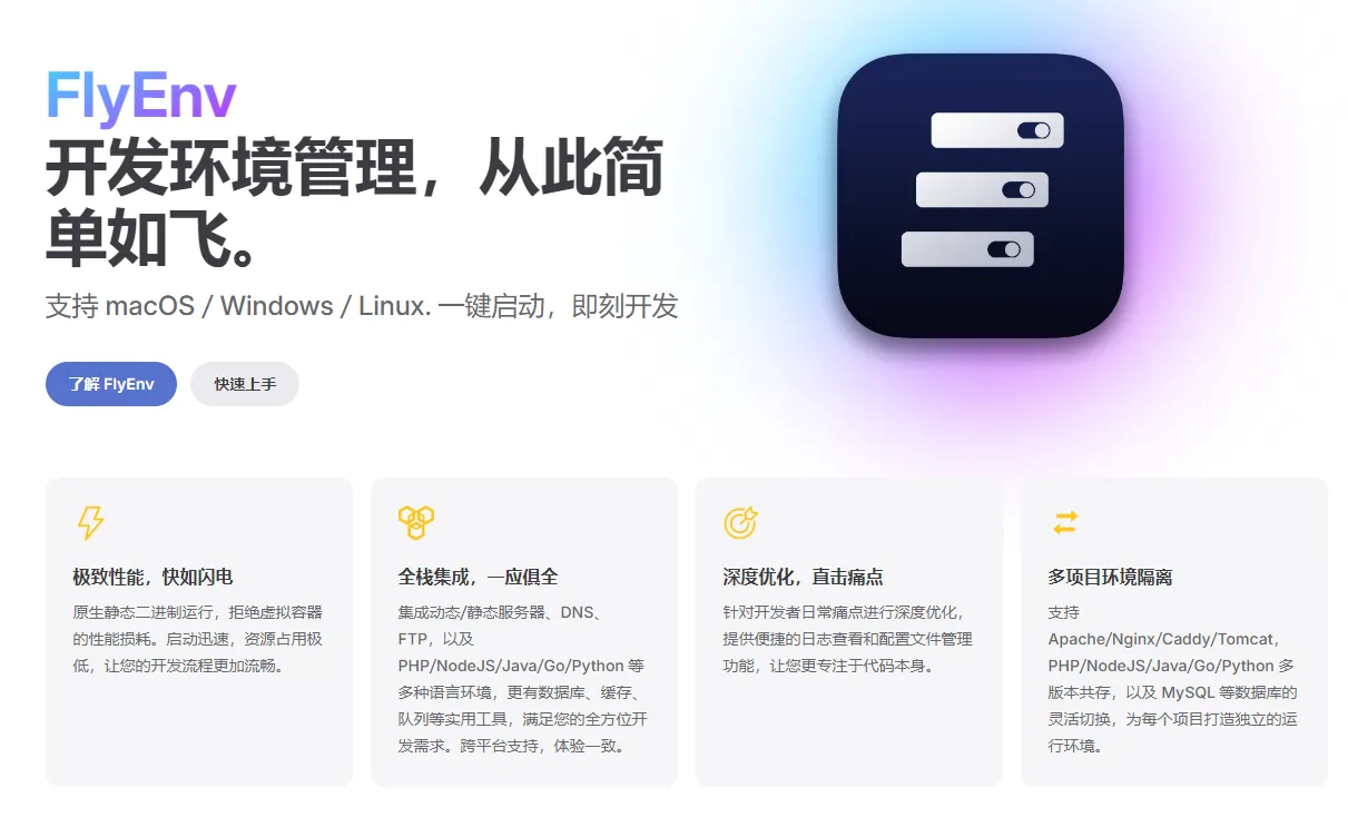 FlyEnv是一个全合一的本地开发环境管理工具,它将复杂的环境配置流程简化到极致。无论你是PHP开发者、Node.js爱好者,还是Java/Go/Rust/Python的使用者,FlyEnv都能在几秒钟内为你搭建一个完整可用的开发环境。