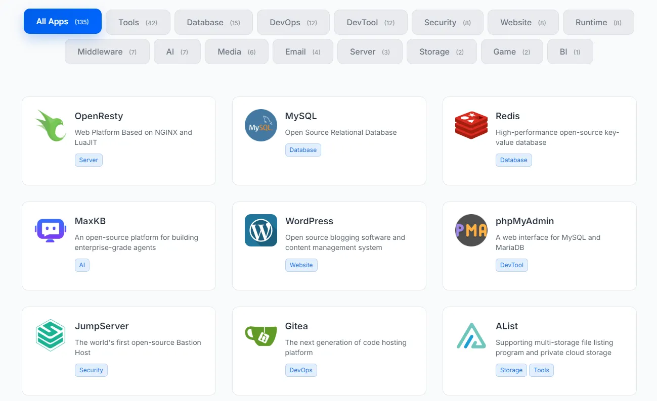 一键部署:通过应用商店,用户可以快速一键部署MySQL、Redis、WordPress等数十种应用,省时省力。