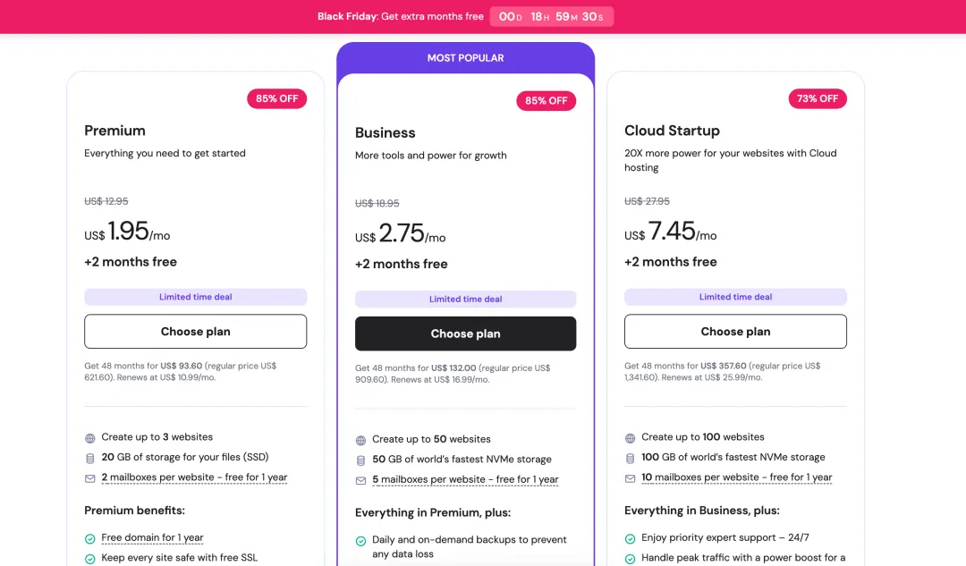 - Business 套餐原价约 $5/月,黑五直接到 $2.75/月。
