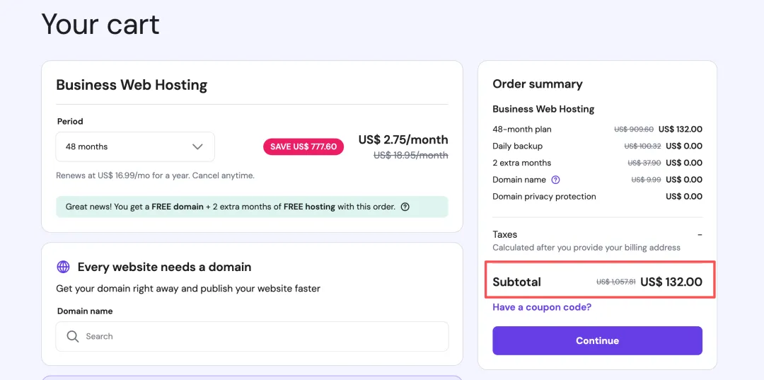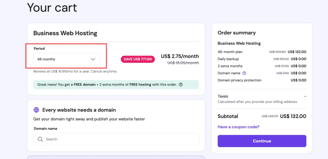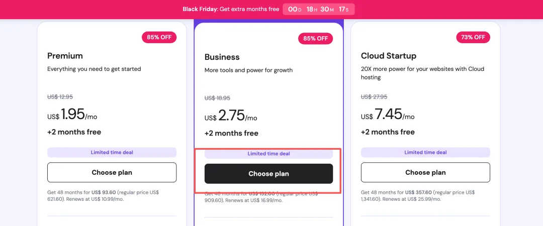 选择套餐:选 Web Hosting 下的 Business 套餐。