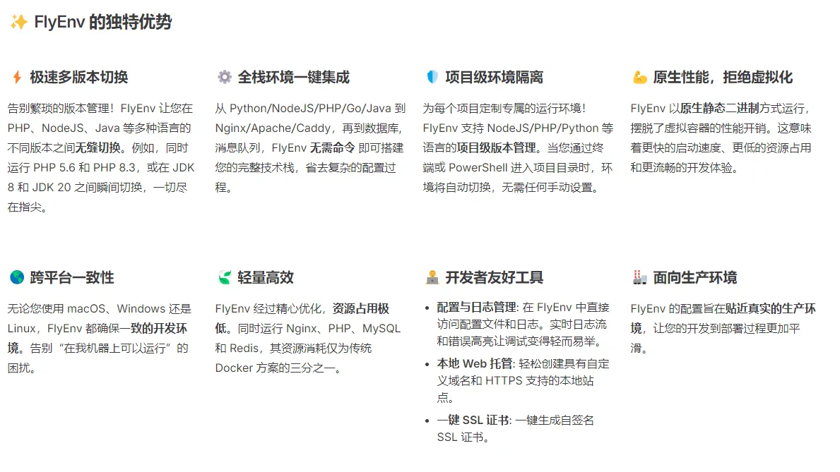 简单来说,FlyEnv让你用一行命令完成过去需要半小时的配置工作。